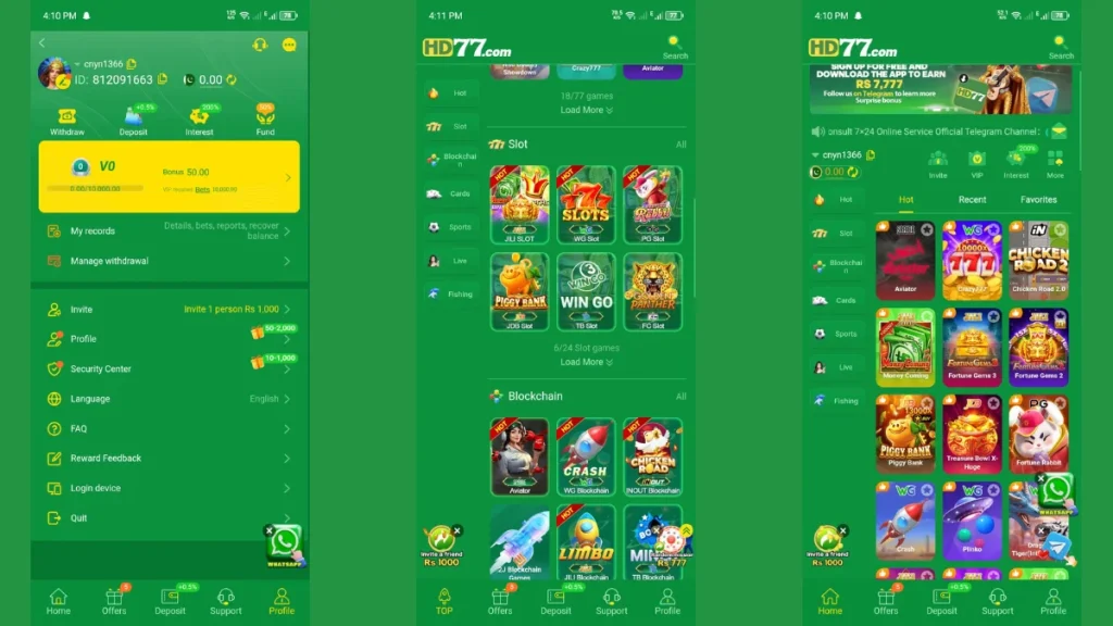 HD77 Game provides a simple and organized mobile gaming platform for Android users. The app combines multiple mini games in one place and focuses on fast performance and easy navigation. Users install the APK, create an account, and start playing through a clear dashboard.